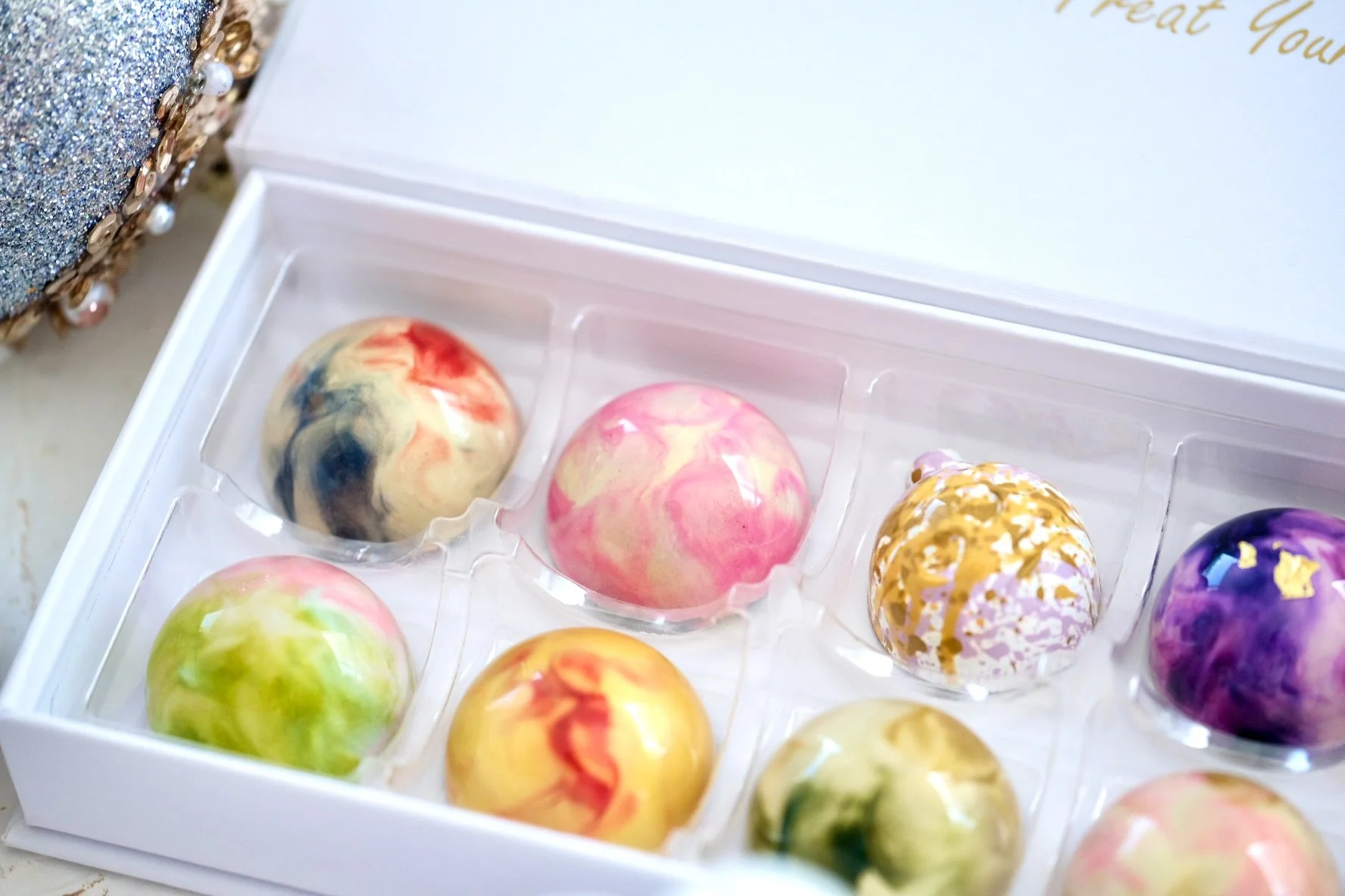 The gloss of couverture chocolate lovingly hand-painted and quietly encasing a verdant filling of the most glorious ganache just waiting to be bitten.